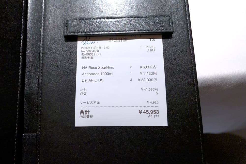 お会計はドリンク入れて2人で、45,953円(税込・サービス料込)