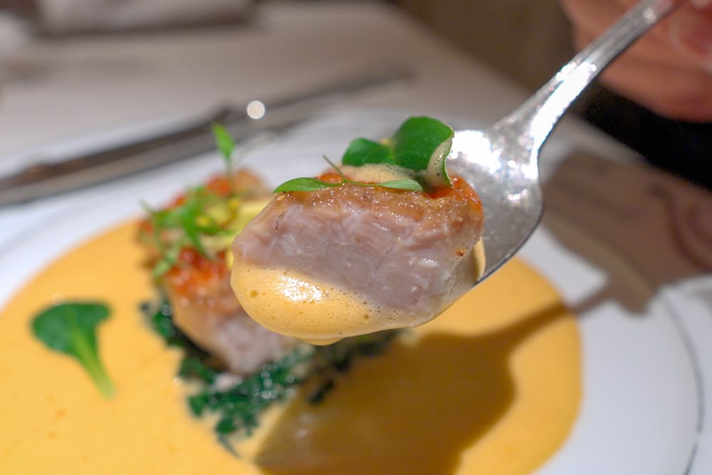 金目鯛の濃厚な脂と上品な白身の旨味に、ポワレで香ばしく焼き上げられた皮の食感。
