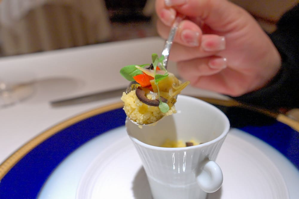 つぶ貝の旨味やサフランの味が合わさって、軽い食感がアミューズブーシュにぴったりです。