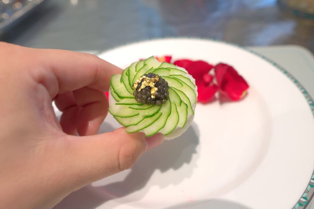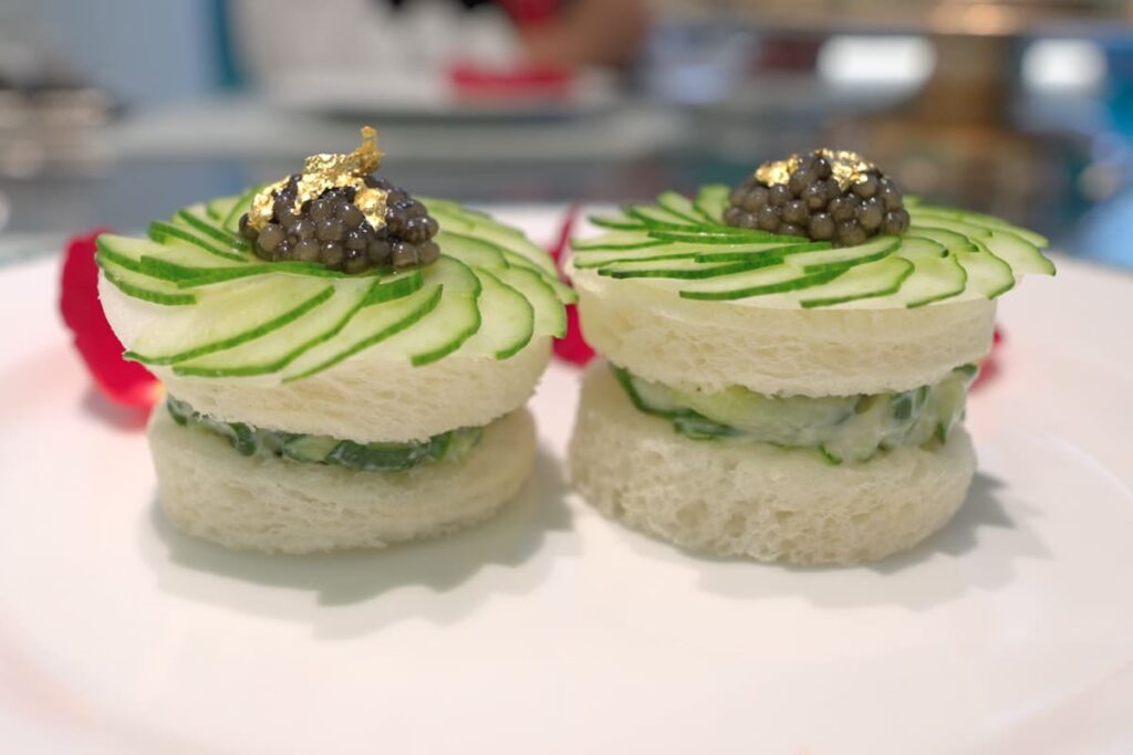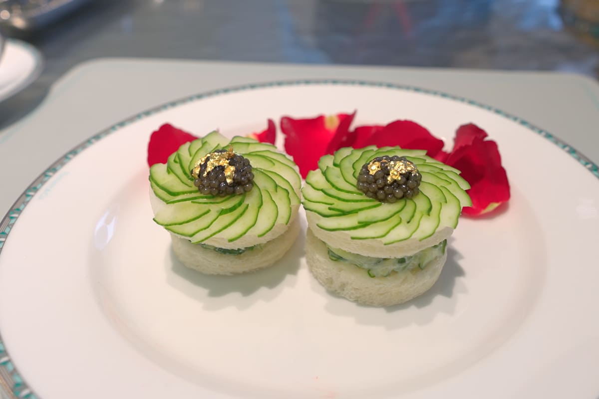 目を惹くのは胡瓜とキャビアのサンドウィッチ。